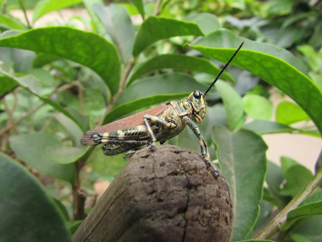Em um belo dia ao entardecer, estava no jardim arrumando as cosias para guardar e molhando algumas plantas. Então ouvi um som agudo e algo, mas fino e ritmado. Então me aproximei do manacá-de-jardim e vi esse grande inseto lá. A primeira coisa que veio na minha cabeça é que era uma vespa, e toda vespa eu sempre mantenho distância, ainda mais uma desse tamanho. Mas na realidade esse nosso amigo ai é um gafanhoto, e ele tem uma habilidade chamada mimetismo, que no qual muitos animais conseguem imitar a forma, estrutura ou cores de outros animais perigosos para se proteger. Traduzindo, eu cai na sua defesa (que por sinal um belo de um mimetismo), mas ainda bem que consegui a foto antes dele fugir.